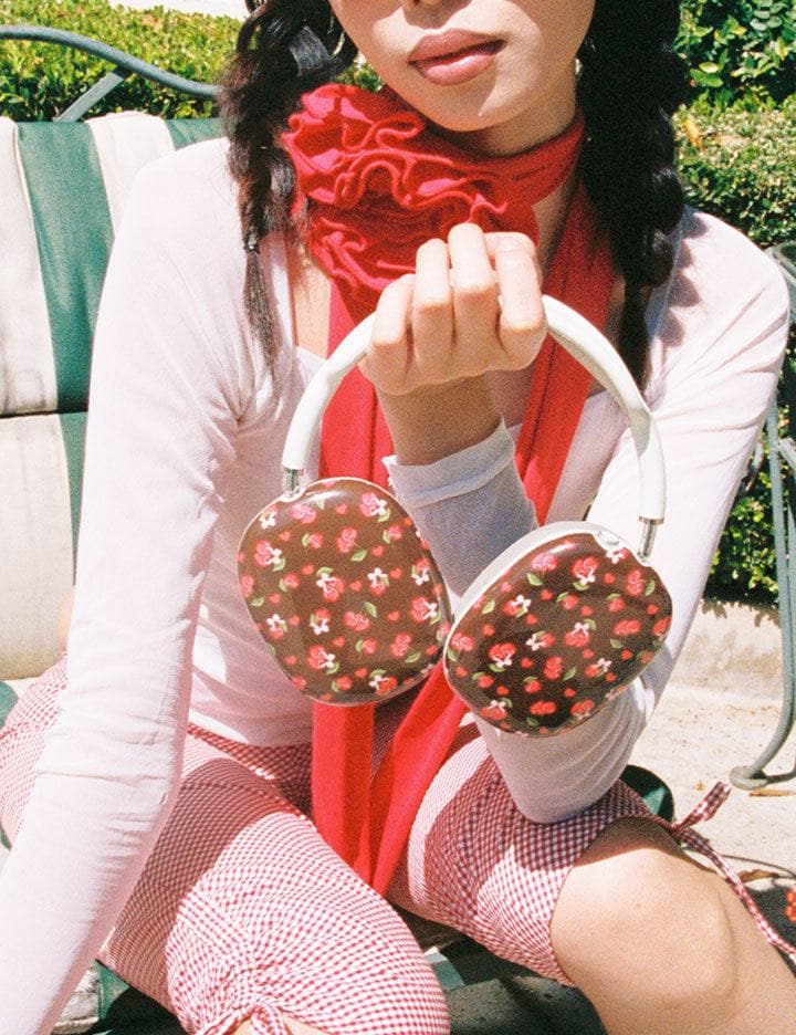 We’re in love with our Chocolate Cherries AirPods Max Cover. A decadent chocolate hue is the backdrop for little cherry fruits and hearts falling across this design. Since Wildflower is all about the details. some of our heart-shaped cherries are even adorned with baby pink bows. Press play on your French-inspired playlist. mon chéri.
